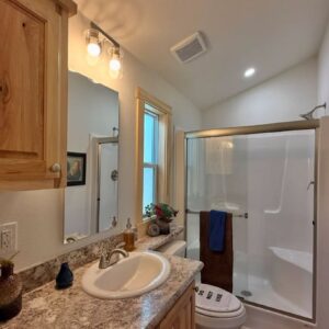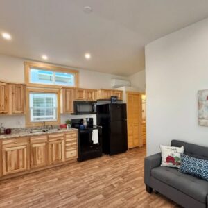This 399 sq. ft. RV park model tiny house is designed in a charming cabin style, featuring hickory cabinets and thoughtful touches throughout. The bedroom boasts a walk-in closet, while the exterior showcases cedar-stained trim and a pet gate, adding a warm and inviting touch.