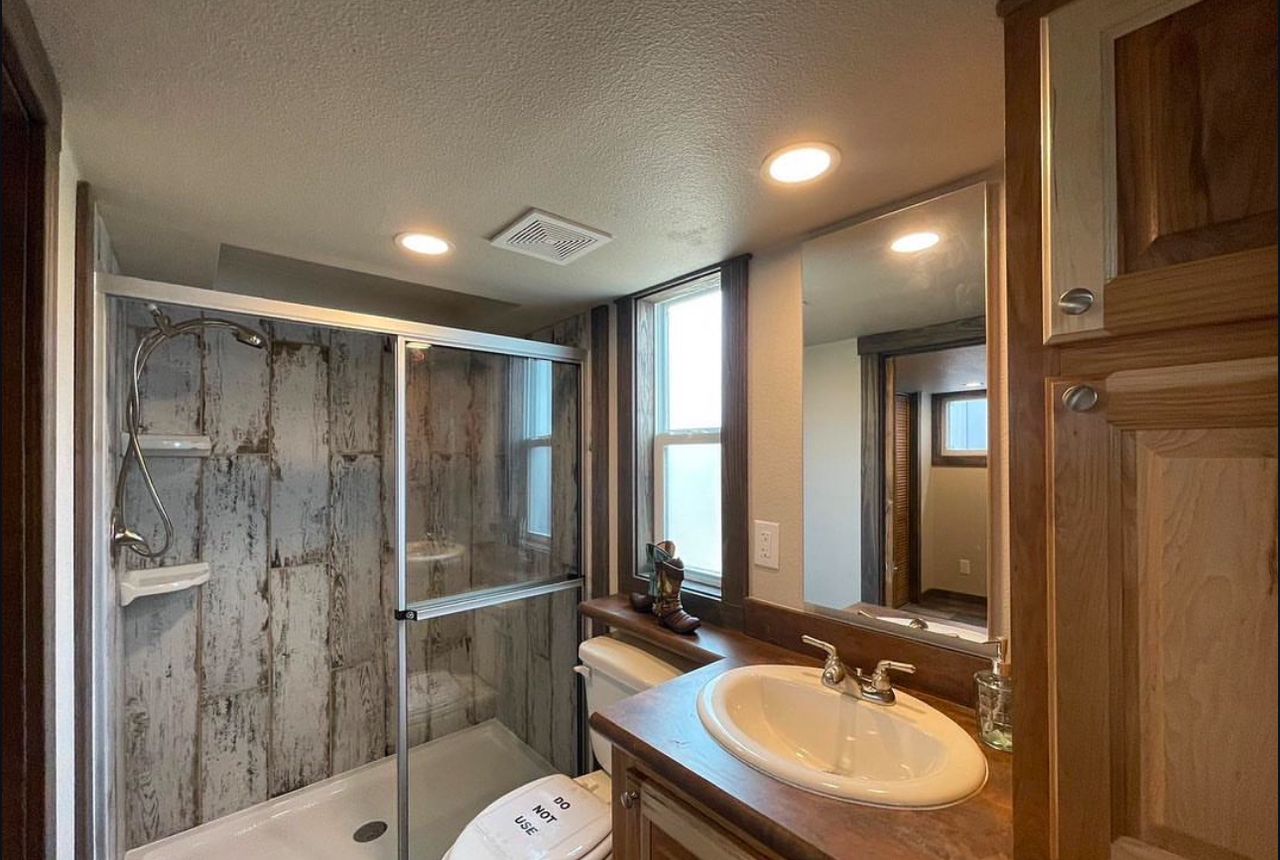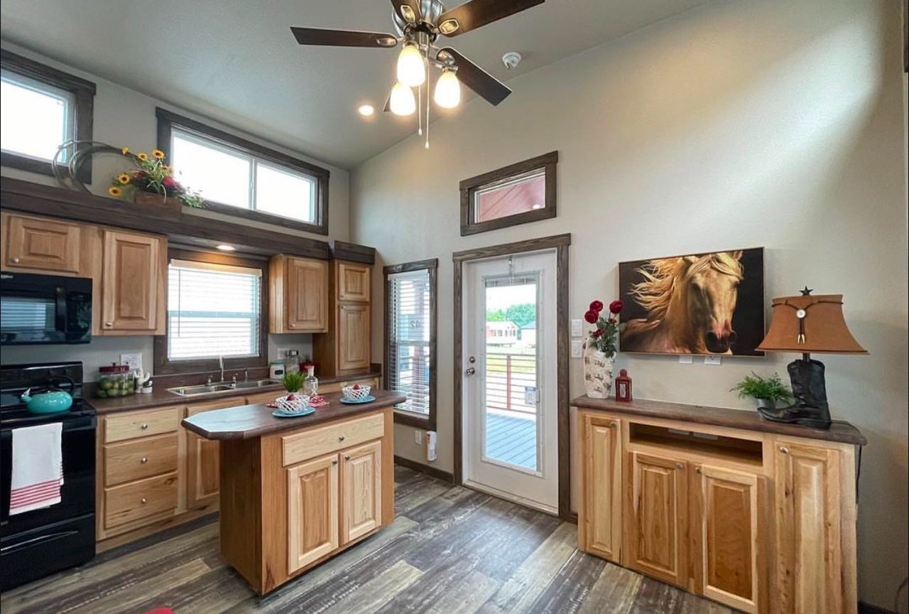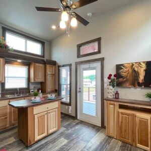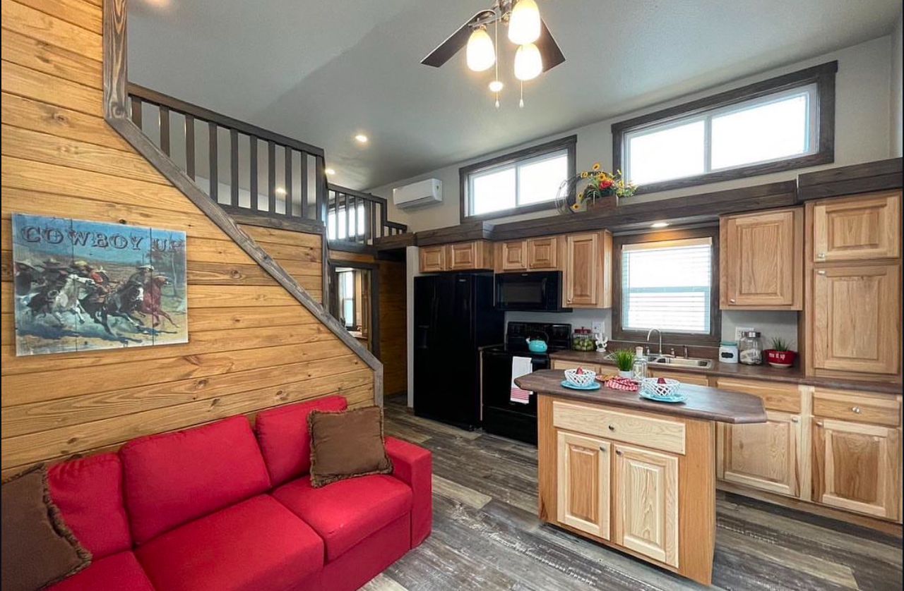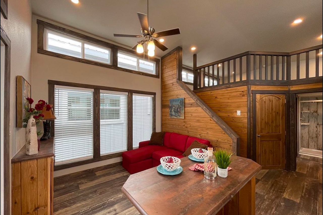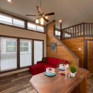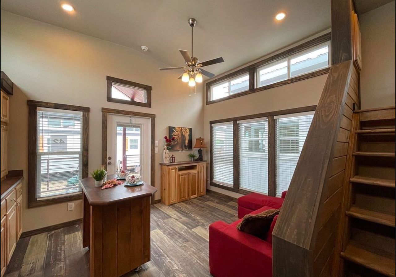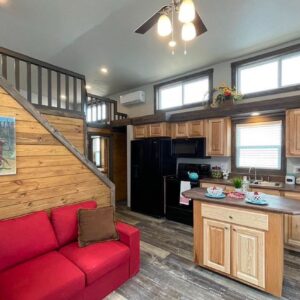 Platinum Cottages model, a premier 399 sq. ft. RV park model tiny house, perfectly suited for various landscapes – be it a ranch, beach, lake, or mountain setting. This charming one-bedroom, one-bathroom abode features a loft and boasts: